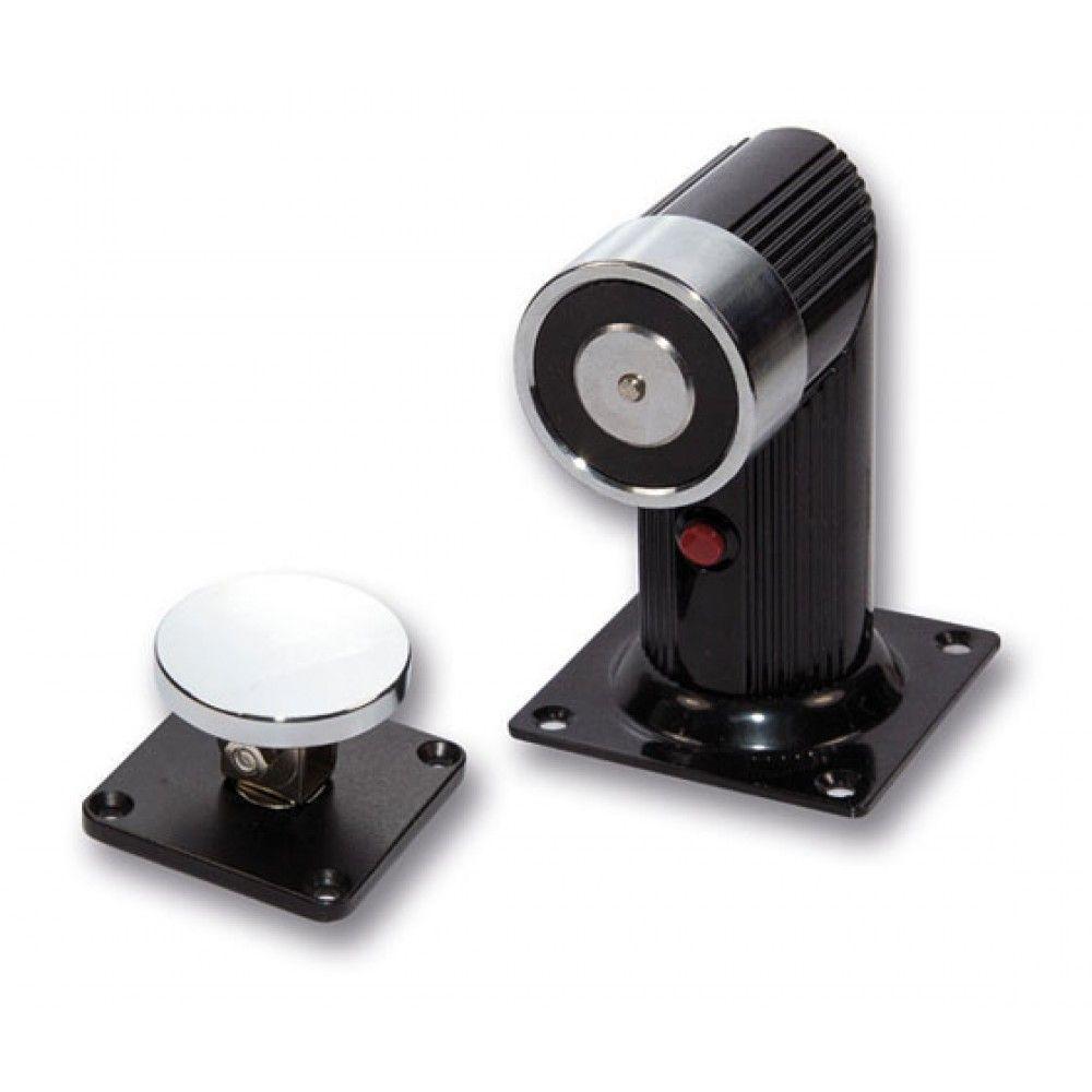 Electro-aimant pour le maintien de porte. D'aspect sobre et discret, ce système s'installe facilement et rapidement sur une porte existante. L'électro-aimant est silencieux.