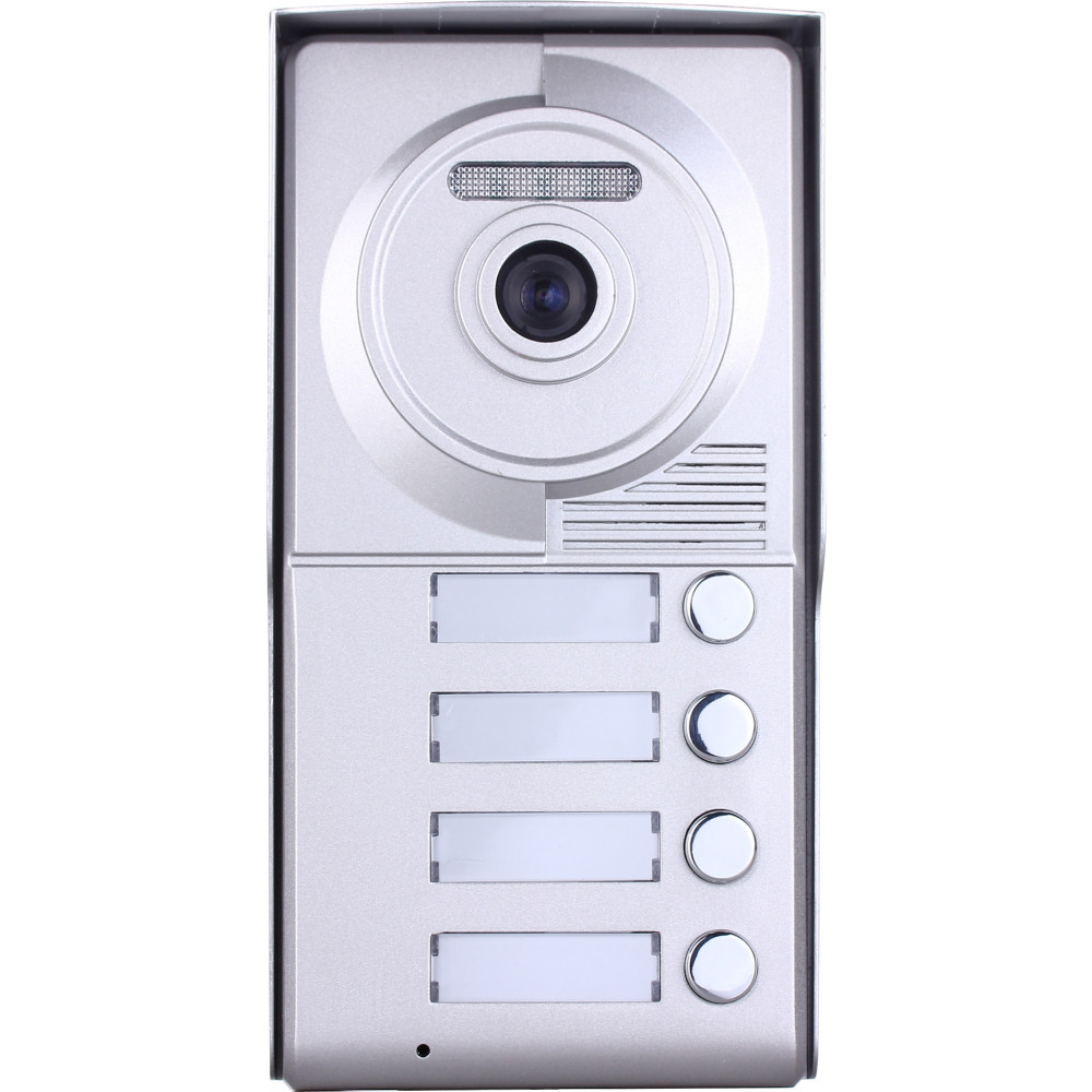 Platine de rue 4 fils pour 4 appartements, dotée de 4 boutons sonnettes distincts et 4 porte-étiquettes. La platine de rue peut fonctionner avec une gâche électrique à émission ou avec une ventouse électromagnétique en ajoutant un relais.