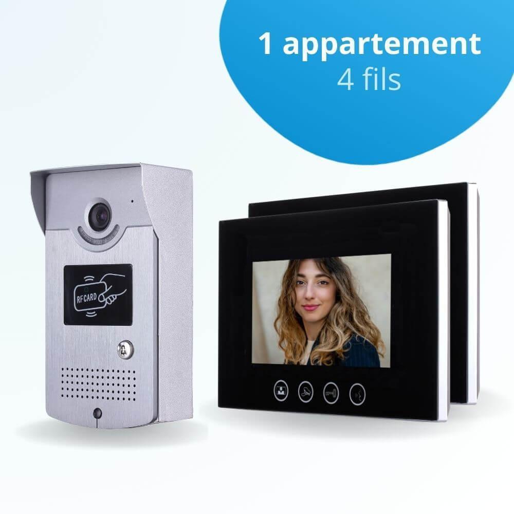 Kit visiophone 4 fils avec lecteur de badge permettant de gérer l'accès d’un logement grâce au portier 1 bouton et aux 2 stations intérieures couleurs 7" à touches sensitives et mémoire photos.
