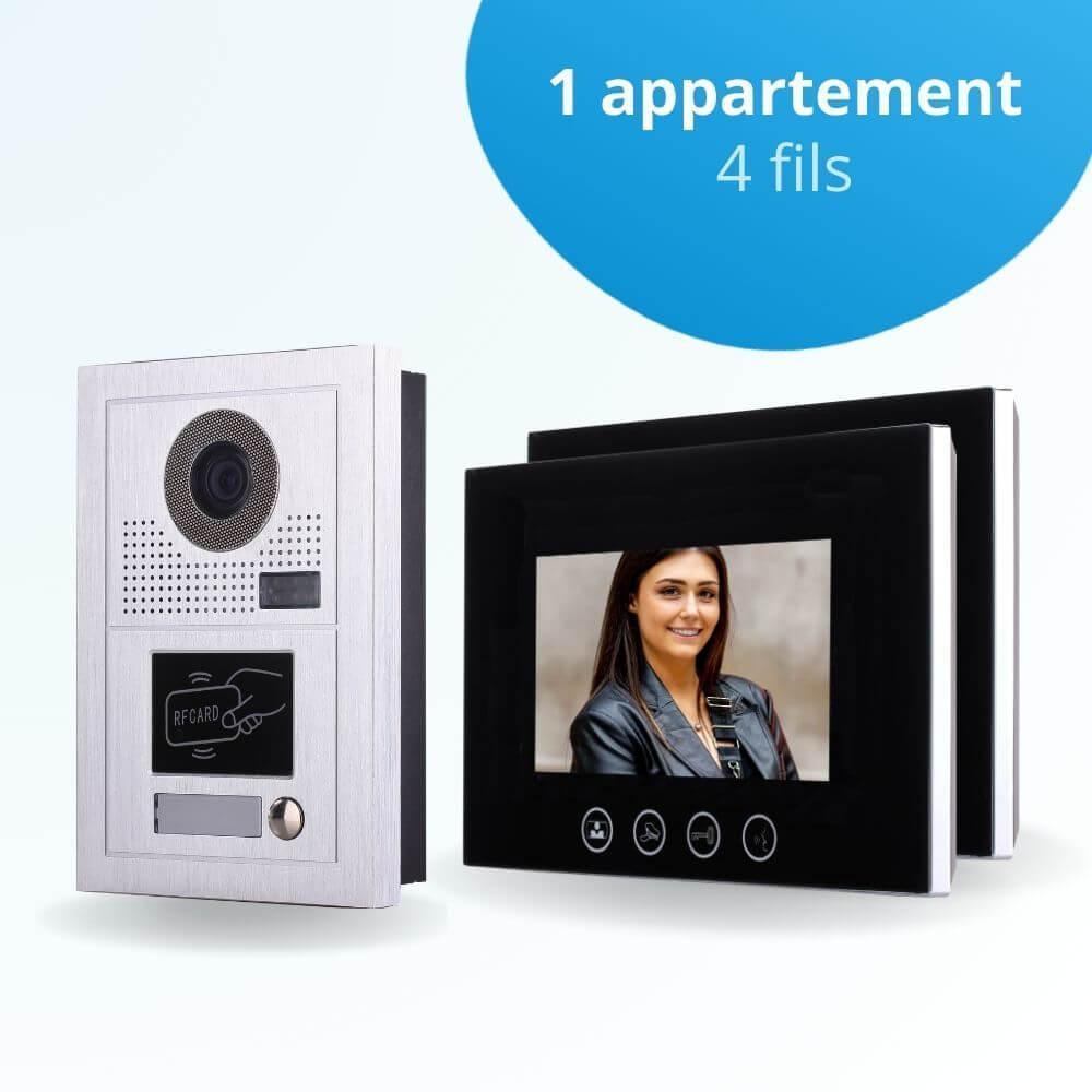 Kit visiophone 4 fils avec lecteur de badge permettant de gérer l'accès d’un logement grâce au portier 1 bouton et aux 2 stations intérieures couleurs 7" à touches sensitives et mémoire photos.