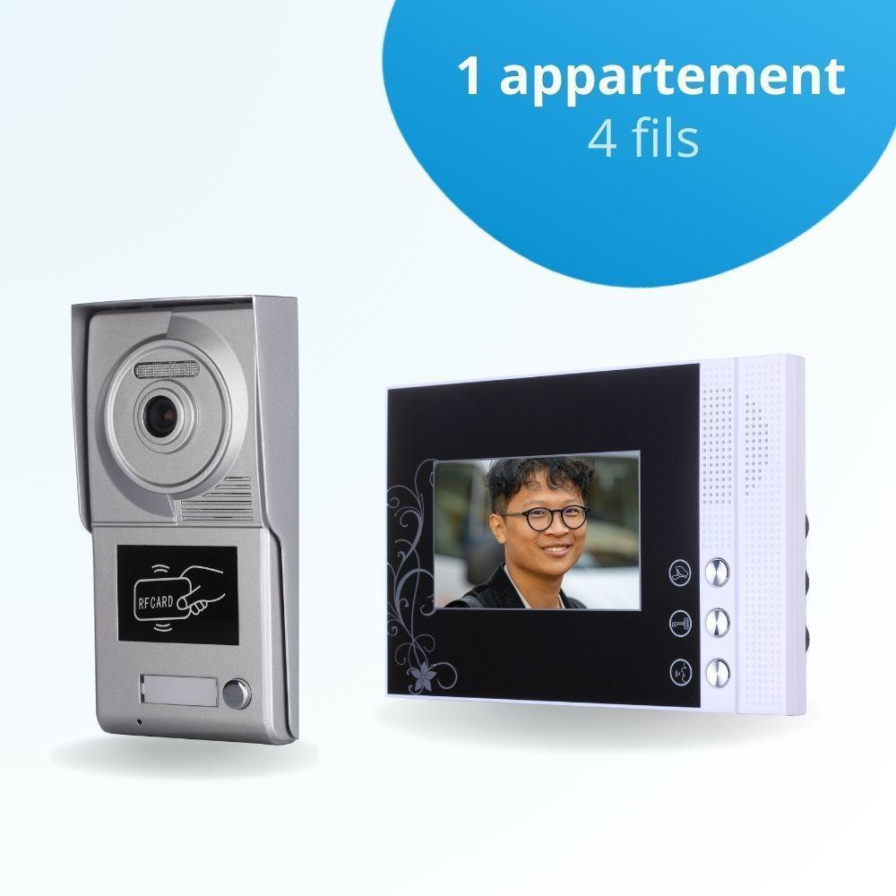 Kit visiophone 4 fils avec lecteur de badge permettant de gérer l'accès d’un logement grâce au portier 1 bouton et à la station intérieure couleurs.