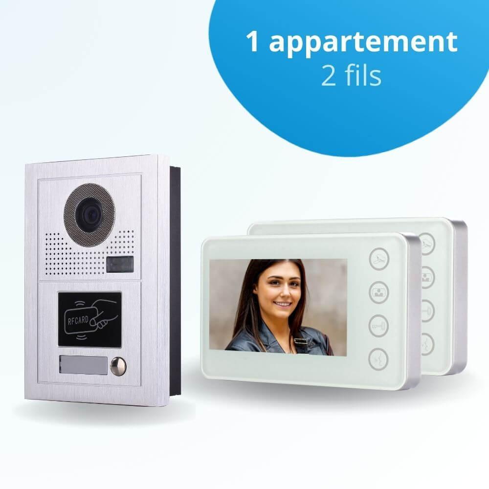 Portier interphone vidéo MODERN 2 Fils - 1 appartement - 2 écrans blancs - avec lecteur de badge