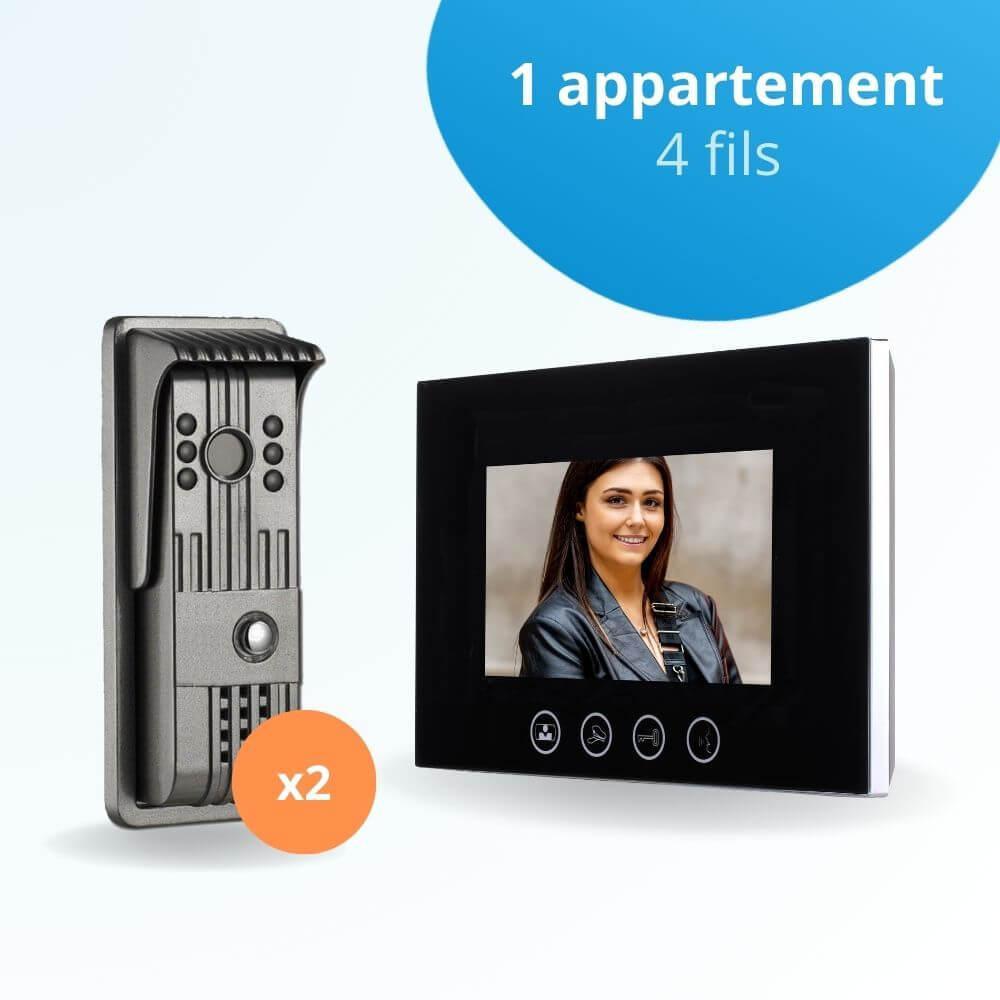 Kit visiophone 4 fils permettant de gérer 2 accès d'un logement grâce aux 2 portiers 1 bouton et à la station intérieure couleurs 7" à touches sensitives et mémoire photos.