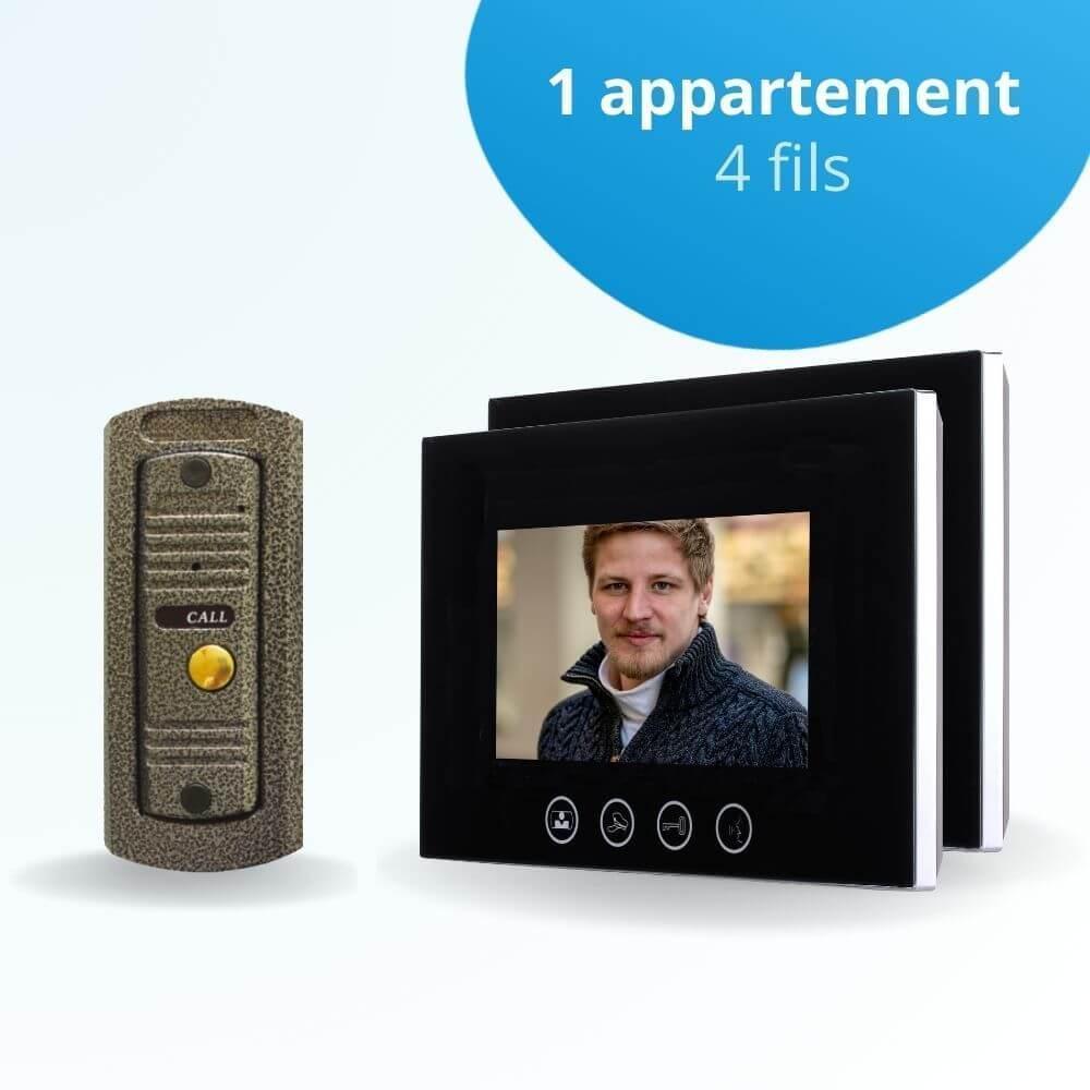 Kit visiophone 4 fils permettant de gérer l'accès d’un logement grâce au portier 1 bouton et aux 2 stations intérieures couleurs 7" à touches sensitives et mémoire photos.